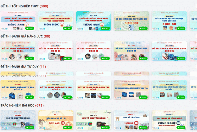 Các bài kiểm tra trên hệ thống được xây dựng bám sát chương trình học, được chia thành nhiều chủ đề rõ ràng như: Trắc nghiệm bài học, Đề kiểm tra giữa học kì I, Đề kiểm tra học kì I, Đề kiểm tra giữa học kì II, Đề kiểm tra học kì II, Đề thi IOE,... và những chủ đề đặc biệt khác. Nhờ sự phân chia hợp lý này, học sinh có thể lựa chọn đúng dạng bài phù hợp với nhu cầu: ôn tập nhanh sau mỗi bài học, luyện đề trước các kỳ kiểm tra chính thức, hoặc thử sức với các đề thi mang tính nâng cao như IOE.