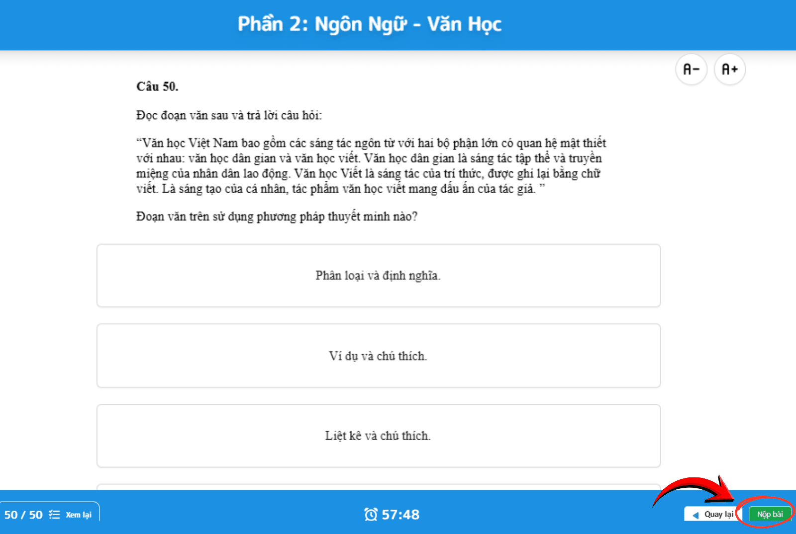 • Bước 4: Sau khi trả lời xong các câu hỏi trắc nghiệm, nhấp vào nút "Nộp bài" để hoàn thành bài kiểm tra.